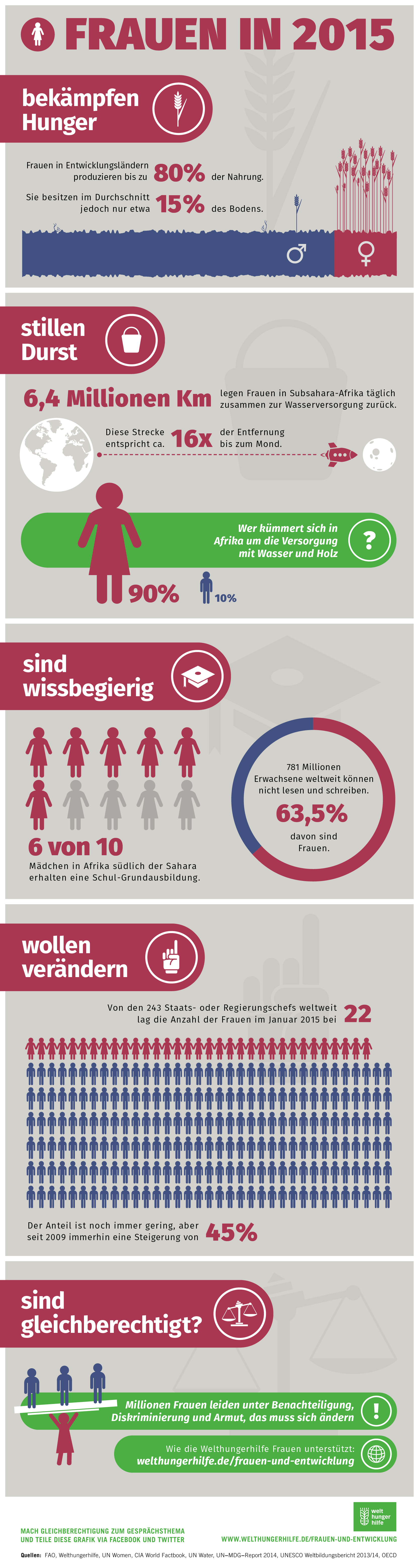Die Gleichberechtigung von Mann und Frau ist ein anerkanntes Menschenrecht. Doch noch immer leiden Millionen Frauen unter Benachteiligung, Diskriminierung und Armut. Oft werden sie unterschätzt oder gar unterdrückt. Die Welthungerhilfe stärkt Frauen und unterstützt sie, ihre Rechte selbstbestimmt einzufordern. Ziele können nur gemeinsam erreicht werden – Männern und Frauen profitieren gleichzeitig von der Arbeit der Welthungerhilfe.