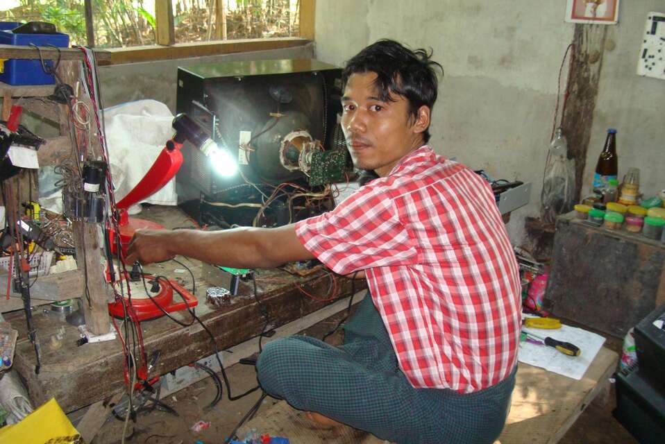 Im Dorf Tadar Oo, das zur Siedlung Htan Tabin gehört, gelange ich über ausgetretene Wege zum Holzhaus von Zaw Moe. Der 29-Jährige nahm vor drei Jahren an einem Training der Welthungerhilfe zum Elektroniker teil. Heute ist er in den Augen der Dorfbewohner ein gemachter Mann. Saya Lea, nennen sie ihn hochachtungsvoll, was soviel bedeutet wie "kleiner Sir".