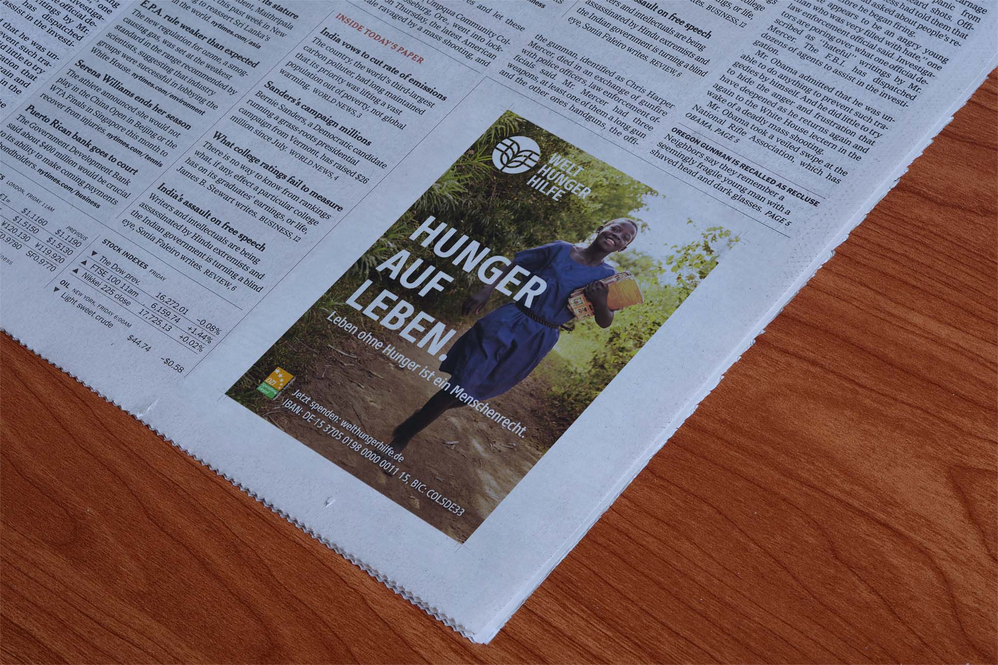 Sie möchten die Arbeit der Welthungerhilfe unterstützen und haben in Ihrer Zeitung, ihrem Unternehmensmagazin oder auf Ihrer Webseite ein wenig freien Platz? Dann helfen Sie uns, indem Sie eine Freianzeigen abdrucken oder einen Banner auf Ihrer Website platzieren.