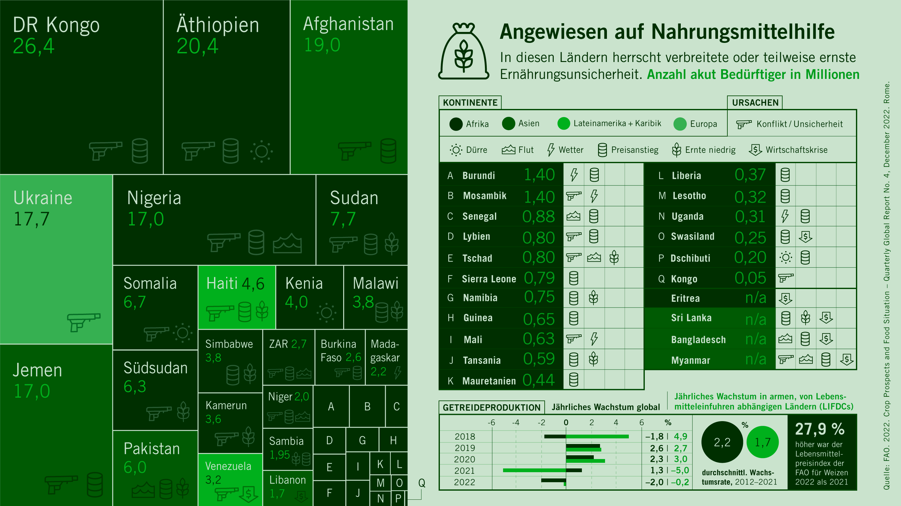 Auch wenn die Preiswarnungen der FAO überschaubar sind und die Weltgetreideernten im Jahr 2022 nur gering unter dem Niveau von 2021 lagen, ist die Lage in Ländern mit niedrigem und mittlerem Einkommen weiter dramatisch. Laut dem Global Information and Early Warning System on Food and Agriculture (GIEWS) sind die Ernteaussichten für Regionen, in denen bereits Hunger herrscht, bedrückend und der Importbedarf hoch.