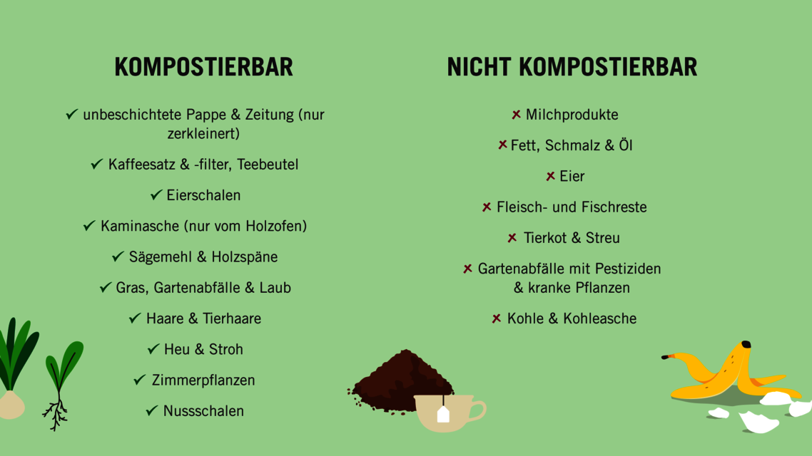 Alle organischen Rohstoffe wie Gemüse, Obst, Eierschalen, Gartenabfälle oder Kaffee können problemlos im Kompost entsorgt werden. Andere gekochte Essensreste sowie Gebäck, Milchprodukte oder Fleisch sollten separat entsorgt werden, da diese Ratten anlocken können. Auch Laub sollte separat kompostiert werden, da die Verrottung von Blättern länger dauert.