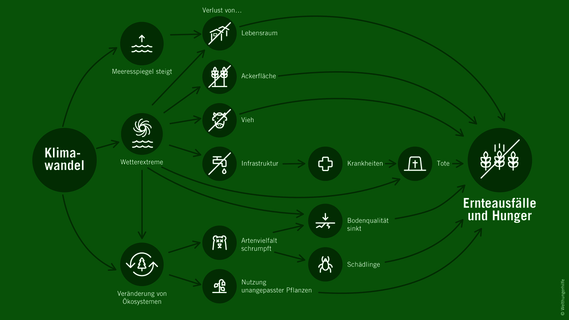 Diese Regionen sind durch den Klimawandel, die Folgen wie Starkregen, Dürre oder Wirbelstürme sowie die Schäden wie ausbleibende oder zerstörte Ernte, am stärksten von Hunger und Ernährungsunsicherheit bedroht.