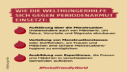 Teile rund um den Menstrual Hygiene Day Beiträge auf deinen Social Media Kanälen. Sprich offen über das Thema Menstruation und erzähle, was eine „Period Friendly World“ für dich bedeutet. Hier findest du Grafiken, die du für deine Social-Media-Beiträge nutzen kannst. Teile auch gerne Posts der Welthungerhilfe zum Menstrual Hygiene Day. So schaffen wir gemeinsam Aufmerksamkeit für die Menstruation, bauen Tabus und Scham ab und tragen zur einer #PeriodFriendlyWorld bei!