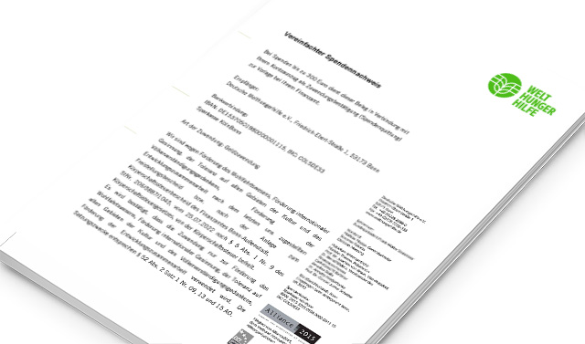 Die Welthungerhilfe versendet automatisch zu Beginn eines Folgejahres Jahreszuwendungsbestätigungen. Sollten Sie eine Einzelquittung oder eine Zweitschrift benötigen, teilen Sie uns dies bitte mit. Bei Spenden bis zu 300 Euro wird auch ein vereinfachter Spendennachweis in Verbindung mit Ihrem Kontoauszug als Zuwendungsbestätigung vom Finanzamt akzeptiert.