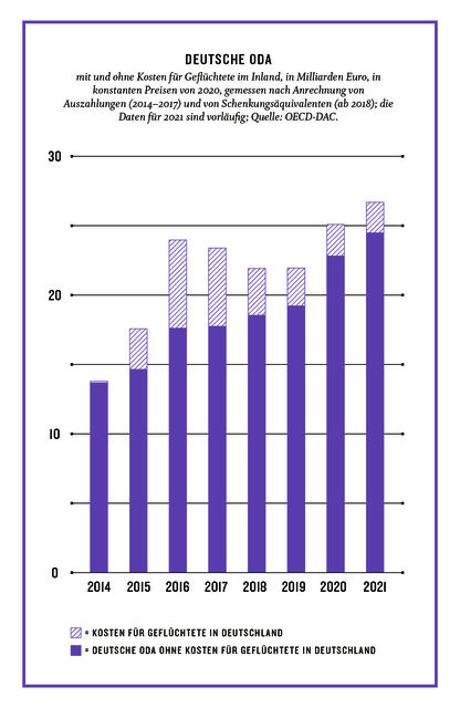 Deutschland hat im zweiten Jahr in Folge – vor allem dank der zusätzlichen Corona-Hilfen – das 0,7-Prozent-Ziel erreicht. Die mittelfristige Finanzplanung des Bundes bis 2026 lässt allerdings offen, ob das Mindestziel von 0,7 Prozent auch in den kommenden Jahren erreicht werden kann.