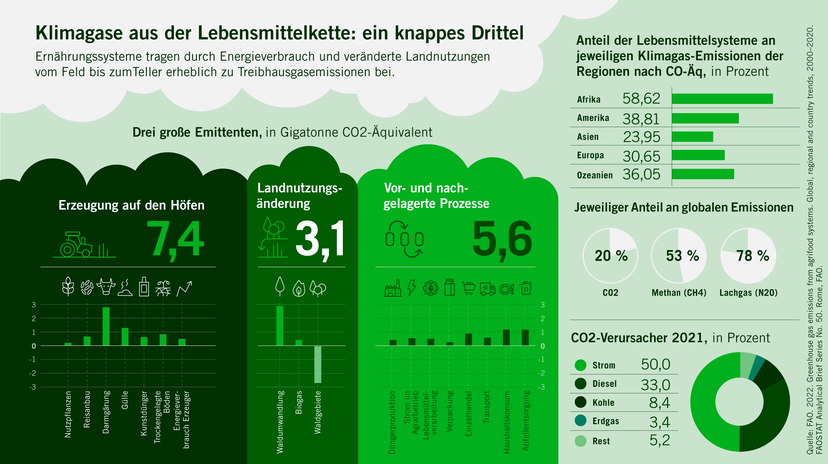 Tierhaltung, Energieverbrauch, Rodungen: Vom Feld bis zum Teller tragen Ernährungssysteme weltweit zu klimaschädlichen Treibhausgasen bei.