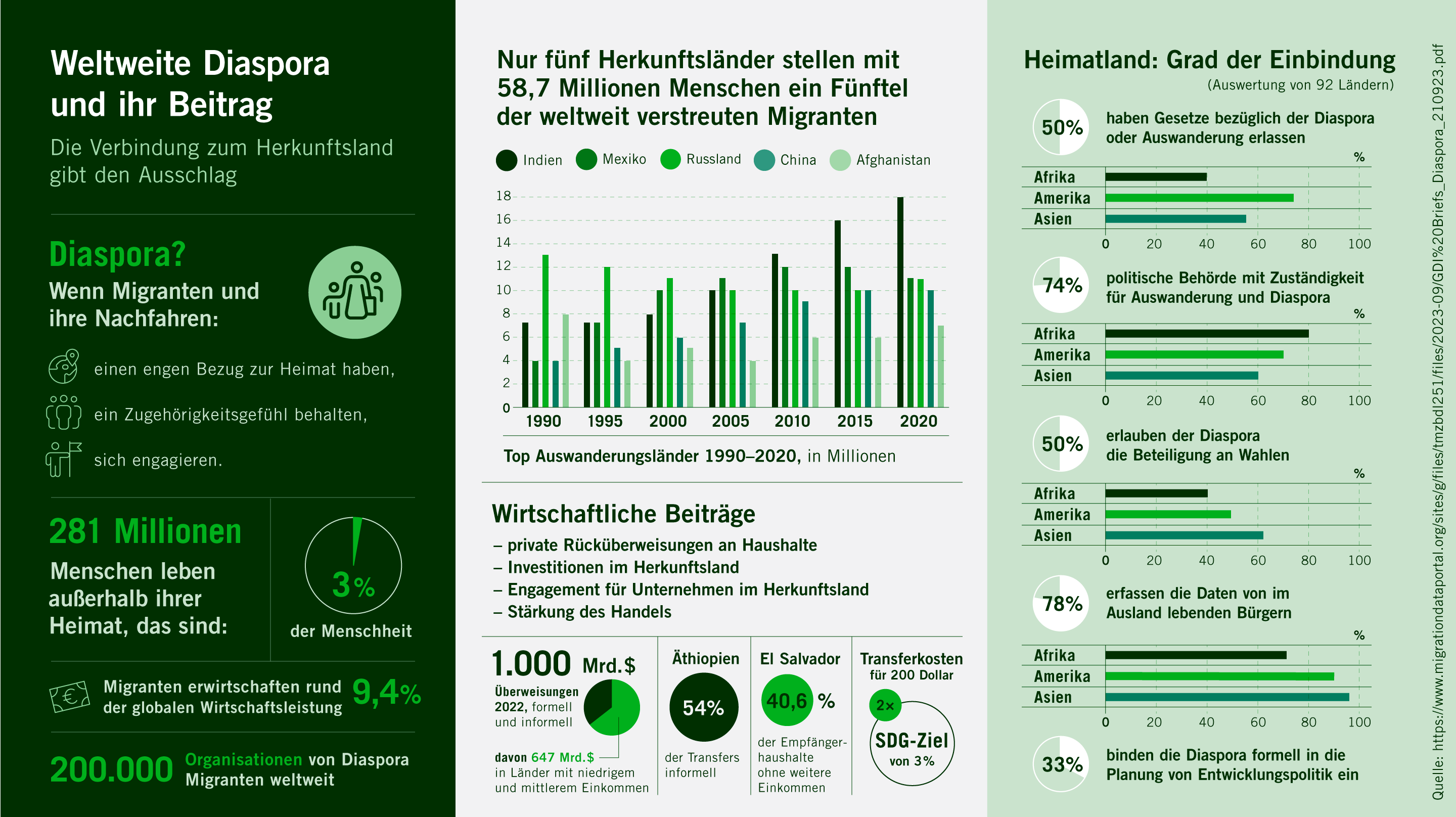 Unter Migranten unterscheidet sich Diaspora durch Zugehörigkeitsgefühl zum Heimatland. Ihr Engagement birgt entwicklungspolitisch Potenzial.