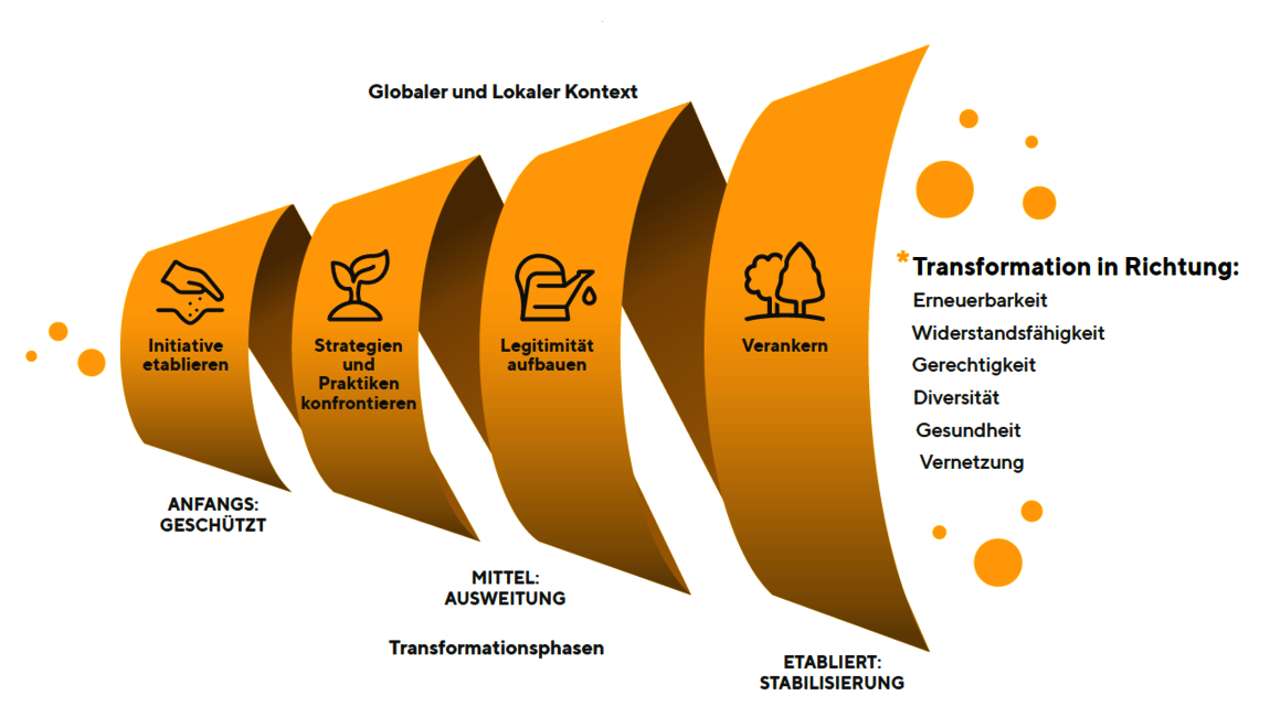 Das Biovision-Team entwickelte aus der Analyse der 21 Beispiele und einer ausgiebigen Literaturrecherche in Zusammenarbeit mit Transformationsexperten ein interaktives Toolkit. Dieses soll Akteuren aus dem Ernährungsbereich helfen, die Veränderungslogik ihrer Projekte und Initiativen besser zu verstehen und von den Erfahrungen der «Beacons of Hope» zu lernen. Kern des Toolkits ist eine «Transformationsspirale» (siehe Abbildung), welche die verschiedenen Phasen einer Initiative und die jeweiligen Herausforderungen und Chancen beschreibt. Im Toolkit gibt es dazu konkrete Beispiele und praktische Hinweise aus den «Beacons of Hope».