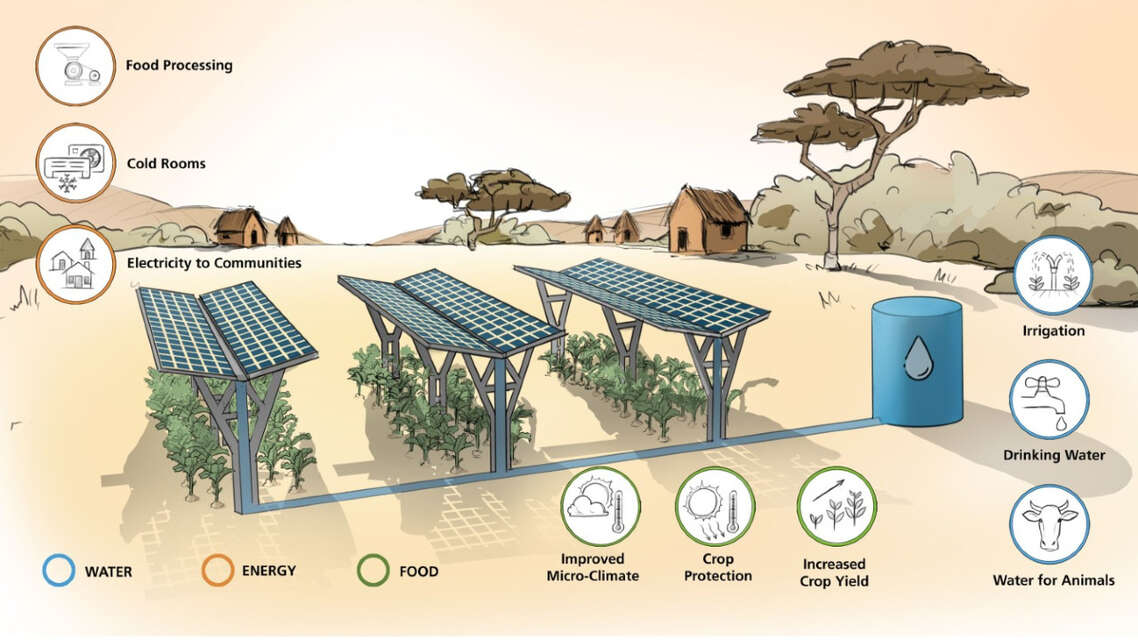 Die Agri-PV ermöglicht, ein Stück Land doppelt oder sogar dreifach zu nutzen, indem dort gleichzeitig landwirtschaftliche Produktion und Stromerzeugung stattfinden; zusätzlich kann potenziell Wassermanagement-Infrastruktur zum Einsatz kommen. Dazu werden Solarpaneele in Reihen auf erhöhten Ständern montiert und erzeugen erneuerbare Energie, während darunter oder dazwischen Nutzpflanzen angebaut werden. Die Paneele werfen Schatten und dienen auch als Schutz für die Pflanzen und den Boden, was potenziell den Ertrag und die Qualität der Ernte erhöht. Agri-PV trägt so zu jeder Komponente des WEF-Nexus bei und kann die Widerstandsfähigkeit der Landwirtschaft gegen den Klimawandel steigern.