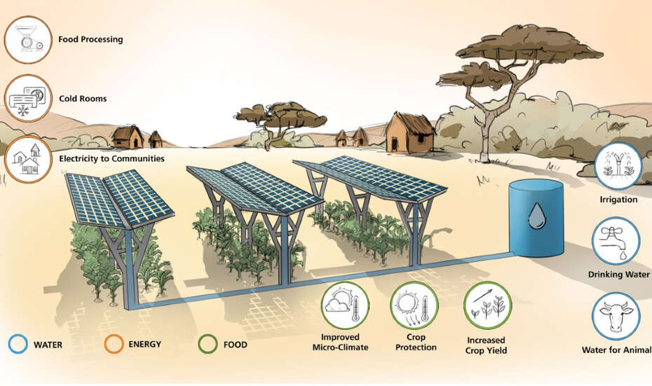 Afrika hat ein sehr großes Potenzial bei der Erzeugung erneuerbarer Energien, besonders durch Photovoltaik (PV). Aber bisher wird Sonnenenergie nur selten genutzt. Der afrikanische Kontinent steht allerdings vor großen Herausforderungen im Kontext des Wasser-Energie-Nahrung-Nexus (WEF). Innovative Lösungen sind gefragt, um den Output der Wertschöpfungsketten in der Landwirtschaft, Energieerzeugung, Wasserversorgung und der Wirtschaft im Allgemeinen zu maximieren. Die sogenannte Agri-Photovoltaik ist ein Ansatz, den man bei der Solarenergie seit etwa einem Jahrzehnt verfolgt. Sie könnte eine Antwort auf die Herausforderungen innerhalb des WEF-Nexus sein.
