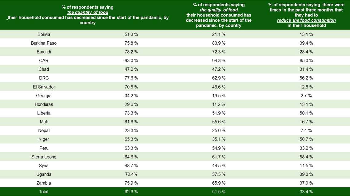 Befragt wurden Vorstehende von 8.461 Haushalten in 18 Ländern in Lateinamerika (Honduras, El Salvador, Peru, Bolivien), Afrika (Mali, Niger, Burkina Faso, Sierra Leone, Liberia, Zentralafrikanische Republik/ZAR, Kongo, Uganda, Burundi, Chad), sowie in Nepal, Syrien und Georgien. Alle teilnehmenden Haushalte werden von Hilfs- oder Entwicklungsmaßnahmen der sieben Organisationen erreicht. 55 Prozent der Befragten sind Frauen; knapp 70 Prozent leben im ländlichen Raum, 20 Prozent in Städten, knapp 11 Prozent in peri-urbanen städtischen Randgebieten und 9 Prozent in Flüchtlingslagern. Eine Auswahl an Ergebnissen der Umfrage kann in diesem Data Dashboard Microsoft Power BI abgerufen werden.