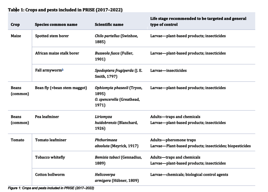 Day, C., Murphy, S.T., Styles, J., Taylor, B., Beale, T., Holland, W., Williams, F., Shaw, A., Finegold, C., Oronje, M., Oppong-Mensah, B., Phiri, N., Lowry, A., Finch, E.A., Mahony, J., Wood, S., Durocher-Granger, L., Chacha, D., Maczey, N., Gonzalez-Moreno, P., Thomas, S.E., Beeken, J., Lewis, J., Saldana, G.L., Duah, S., Bundi, M., Wasilwa, L., Amata, R., Musila, R., Mutisya, D., Gitonga, C.K., Kalama, P., Nyasani, J.O., Matimelo, M., Mgomba, H., Gaitu, C., Ocloo, C., Adjei-Mensah, I., Ohene-Mensah, G., Nboyine, J.A. and Susuwele, B. (2024). Forecasting the population development of within-season insect crop pests in Sub-Saharan Africa: The Pest Risk Information Service. Journal of Integrated Pest Management 15(1): 7.