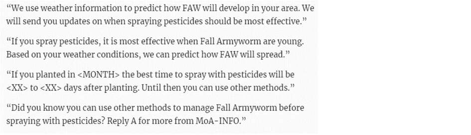 Khonje, M. G., Tambo, J. A., Chacha, D.,Mbugua., Holland, W. Lowry, A. Beale, T., Taylor, B., Day, C. Williams, F. (2024 in prep) Pest information and farm performance: Experimental evidence from Kenya. American Journal of Agricultural Economics.