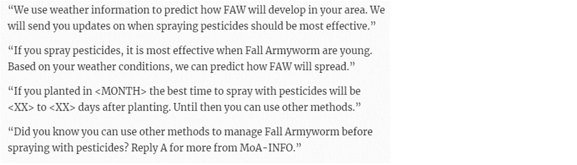 Seit PRISE 2017 mit der Arbeit begann, wurden mehr als zwei Millionen Kleinbauern erreicht. Wir haben zwei Methoden entwickelt, um unsere Warnhinweise (TTA) zu verbreiten: Zunächst über maßgeschneiderte, räumlich und zeitlich spezifische SMS-Nachrichten in der Anfangsphase der Anbausaison. Sie lauten etwa so: