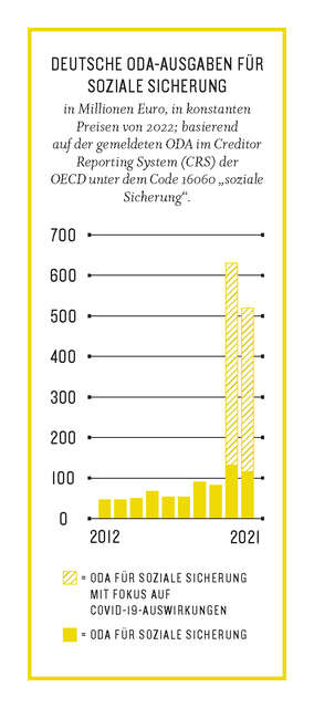 Der im Kompass grafisch dargestellte Aufwuchs von ODA für soziale Sicherung in den Jahren 2020 und 2021 ist größtenteils auf die Linderung von Covid-19-Auswirkungen auf Haushalte zurückzuführen – und hat somit wenig mit der nachhaltigen Stärkung von sozialen Sicherungssystemen zu tun. Zudem bestehen die Mittel mit Covid-19-Fokus in beiden Jahren jeweils zur Hälfte aus Krediten an die indische Regierung, um schwere Folgen der Pandemie abmildern zu können.