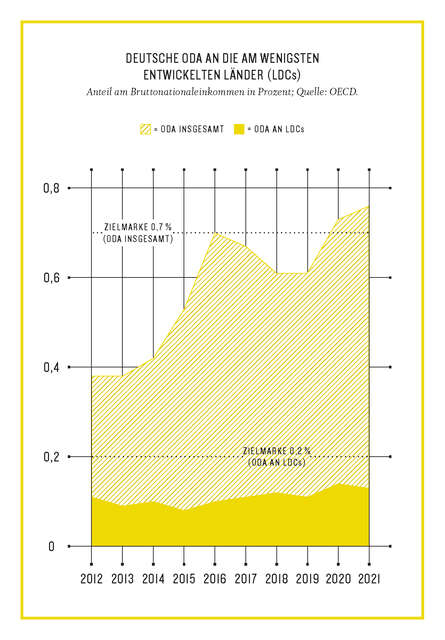 Eben diese Krisenfolgen haben den prozentualen Anteil der Entwicklungsausgaben am Bruttonationaleinkommen (BNE) zum dritten Mal in Folge über die wichtige Mindestzielmarke von 0,7 Prozent steigen lassen. Die Zielmarke besteht seit 1970 und wurde, außer in den vergangenen drei Jahren, nur 2016 erreicht – also in 53 Jahren nur viermal. Trotz des Anstiegs deutscher Ausgaben für Entwicklungszusammenarbeit auf Rekordhöhe bewegen sich die anteiligen Ausgaben für die am wenigsten entwickelten Länder (LDCs) auf einem Niveau wie vor etwa zehn Jahren. 0,2 Prozent des BNE lautet hier das Ziel – und wird regelmäßig mit Werten um 0,13 deutlich unterschritten.