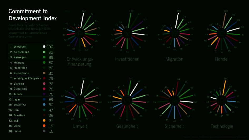 Der Commitment to Development Index (CDI) des in Washington und London ansässigen Thinktanks Center for Global Development bewertet in seiner neuesten Ausgabe 40 einflussreiche Länder danach, wie sie sich für internationale Entwicklung einsetzen. Dabei verstehen die Autoren unter Entwicklung weit mehr als die Ausgaben für Entwicklungszusammenarbeit und humanitäre Hilfe. Anhand von insgesamt mehr als 40 Indikatoren listet der Index Rangfolgen für acht Politikbereiche auf: die Quantität der staatlichen Auslandshilfe und ihre Qualität, Investitionen, Migration, Handel, Umwelt, Gesundheit, Sicherheit und Technologie. Aus der Zusammenfassung der acht Bereiche ergibt sich eine Rangfolge für das Gesamt-Engagement.