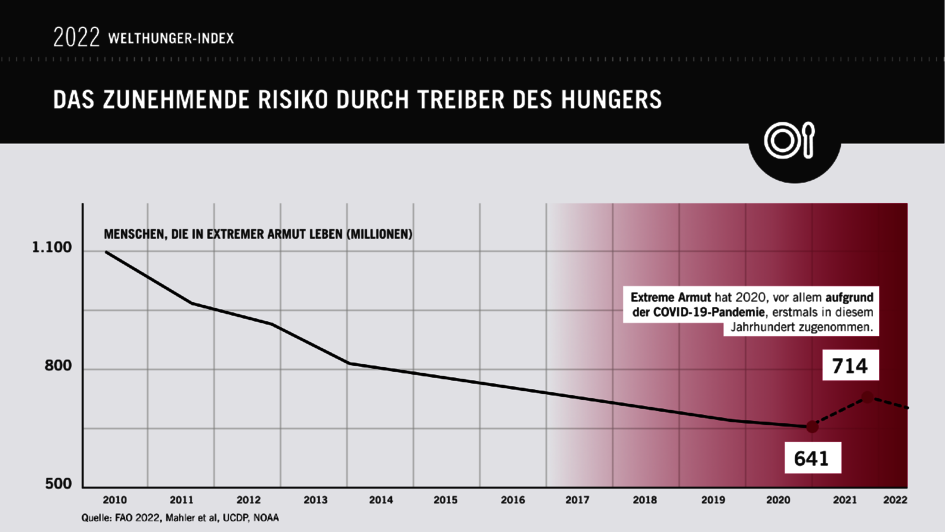 Globale Höchststände bei Nahrungsmittelpreisen im Frühjahr 2022, die erstmalige Zunahme extremer Armut in diesem Jahrhundert im Jahr 2020, die Verdoppelung weltweiter Konflikte von 2010 bis 2021 und das ungehinderte Voranschreiten der Klimakrise durch die Zunahme der globalen Erderhitzung im Vergleich zum 20sten Jahrhundert, mit vermehrten Wetterextremen, bieten kein geeignetes strukturelles Umfeld, um den Hunger zu beenden.