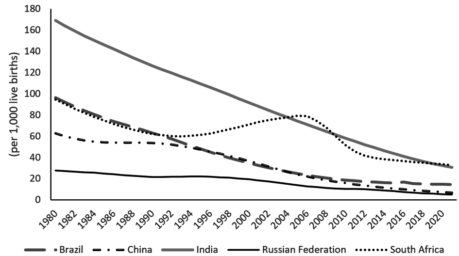 Die Schaubilder 2 bis 5 zeigen die demografischen Entwicklungen in den BRICS-Staaten anhand von vier Indikatoren. Es lässt sich erkennen, dass in all diesen Staaten die Kindersterblichkeit und die Fertilitätsrate drastisch gesunken sind, während die Lebenserwartung und der Anteil der Älteren in den vergangenen Jahrzehnten deutlich gestiegen sind. Allerdings war die letzte Gruppe negativ von der Covid-19-Pandemie betroffen.