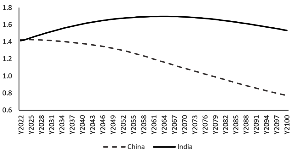 Schaubild 1: Bevölkerungsprognose für China und Indien 2022-2100