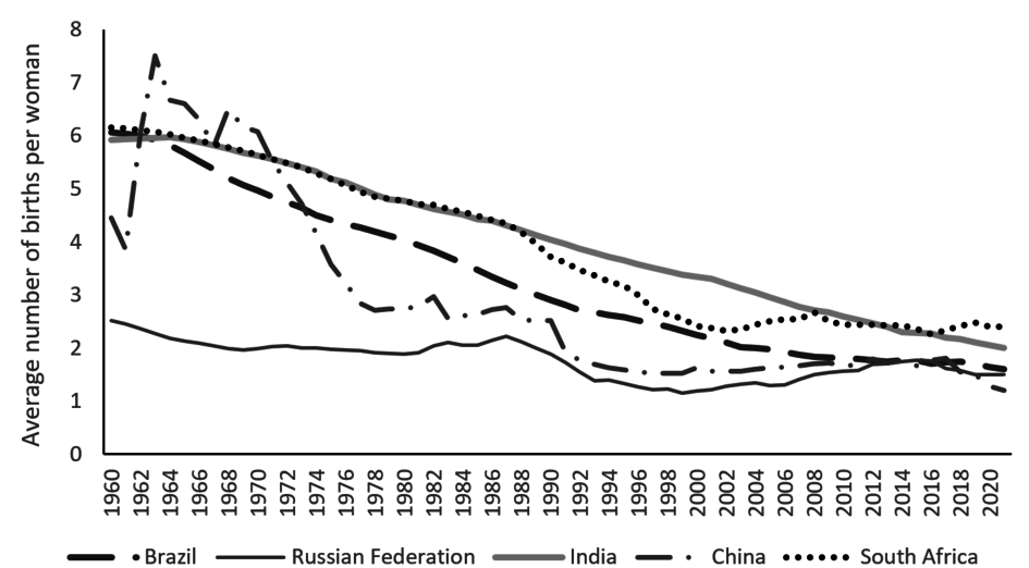 Schaubild 3: Fertilitätsrate der BRICS-Staaten 1961-2021