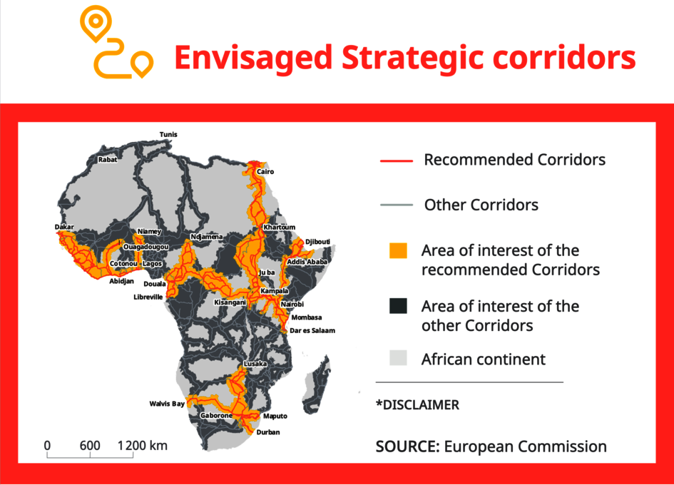 Die Integration der europäischen und afrikanischen Verkehrsnetze soll das Sprungbrett sein, um das wirtschaftliche Potenzial einer Freihandelszone, die den gesamten afrikanischen Kontinent umfasst, freizusetzen. In diesem Sinn wurden im April 2023 87 neue Projekte angekündigt, darunter 11 strategische Korridore.