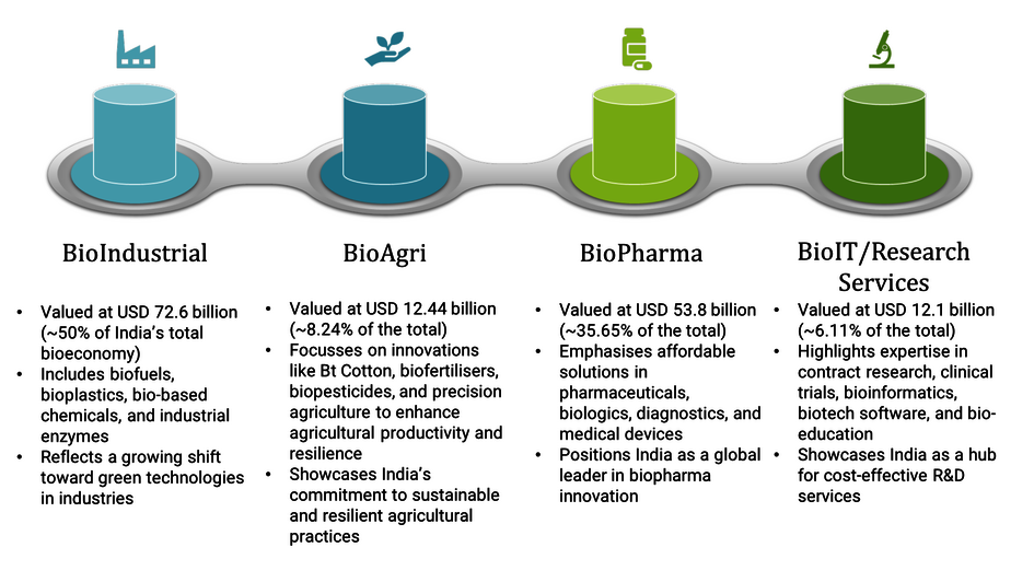 BioIndustrial: Mit 72,6 Mrd. Dollar macht sie etwa 50 Prozent der gesamten indischen Bioökonomie aus. Dazu gehören Biokraft- und -kunststoffe, biobasierte Chemikalien und industrielle Enzyme. Dieses Segment ist ein Eckpfeiler der indischen Bioökonomie.