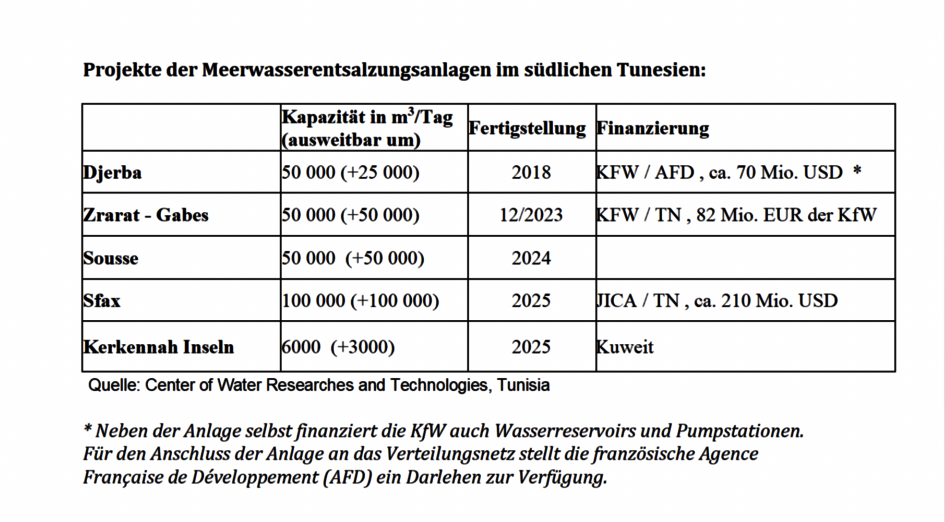 Im April verkündete der Präsidentenpalast in einer Pressemitteilung sinngemäß, dass langfristig große solarbetriebene Entsalzungsanlagen und eine Wasser-Pipeline vom Golf von Gabes nach Gafsa gebaut werden sollen, um „Phosphat zu waschen“ und „das Saharaland in Grünzonen umzuwandeln“. Die deklarierten Zukunftsvisionen des autoritär regierenden Saied betreffen die industriellen Küstenregionen im Süden Tunesiens.