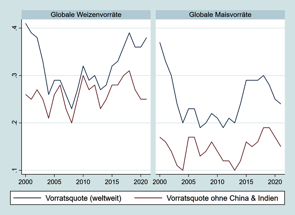 Abbildung 2: Globale Lagerbestände relativ zur Gesamtnachfrage mit und ohne Berücksichtigung Chinas und Indiens