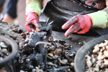 - Die Nüsse werden einer thermischen Behandlung unterzogen, um die äußeren Schalen spröde zu machen. Die gängigen Methoden sind hierbei Dämpfen, Rösten oder das Eintauchen in heißes Ölbad.